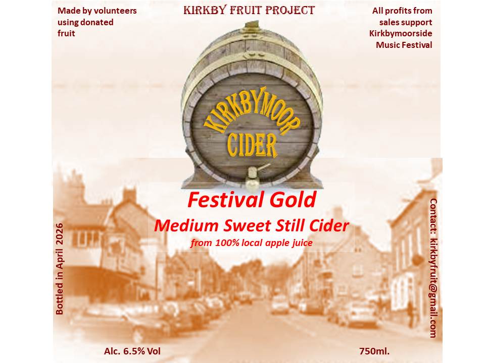The Kirkby Fruit Project are supporting the Kirkbymoorside ‘Gateway to the Moors’ Music Festival 2026 by producing, free of charge, a limited edition festival Cider – a medium sweet ‘Festival Gold’ and and a dry ‘Gateway to the Moors’ cider to sell exclusively at next year’s festival. The festival is organised and run entirely by local volunteers and the cider will be sold to help them to raise the funds they need to continue.